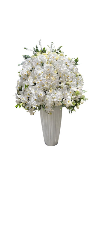 این دستهگل باشکوه با ترکیب چشمنواز گلهای سفید از جمله ارکیدههای لطیف و رزهای کوچک، درون گلدانی سفید و مینیمال قرار گرفته و جلوهای خیرهکننده از ظرافت و عظمت را به نمایش میگذارد. چیدمان دقیق و هنرمندانهی گلها در کنار برگهای سبز و شاخههای تزئینی، این اثر را به نمادی از زیبایی بینقص و سلیقهی منحصربهفرد تبدیل کرده است. مناسب برای مراسمهای خاص، فضاهای لوکس، یا هدیهای باشکوه برای عزیزان، این دستهگل تجسمی از آرامش، شکوه و لطافت در قالبی مدرن و زیباست.
